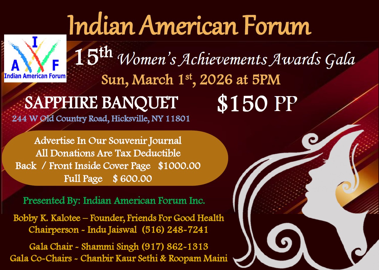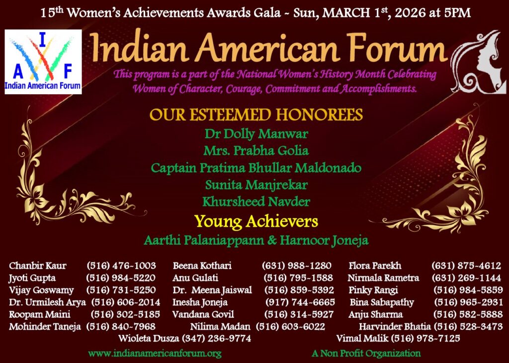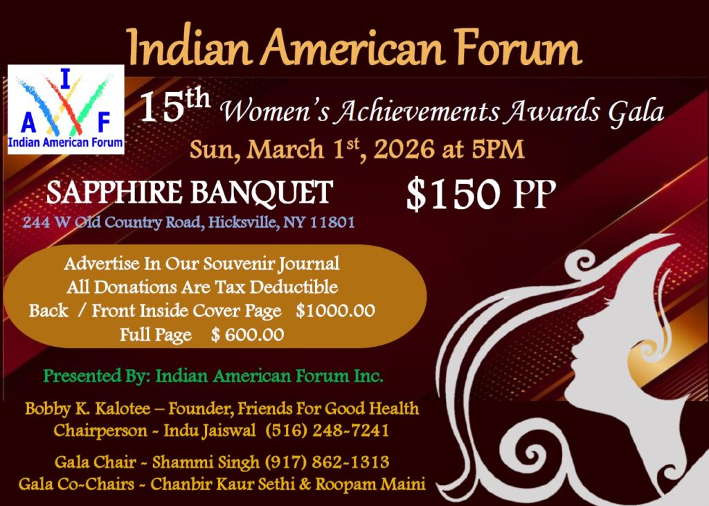 On Sunday evening, March 1st, over 200 distinguished guests gathered at The Sapphire, located at 240 West Old Country Road in Hicksville, NY, to honor the remarkable achievements of this year’s honorees at the 15th outstanding Women’s Achievement Awards Gala, hosted by The Indian American Forum (IAF). This annual event, held during Women’s History Month, is dedicated to recognizing exemplary women for their unwavering courage, commitment, and compassion.